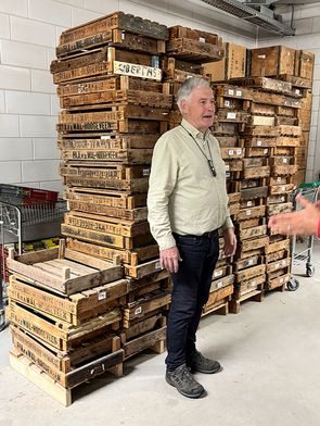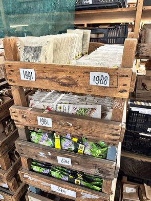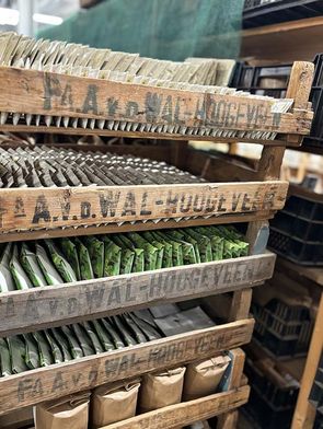 Verder naar achteren werd de sfeer wat nostalgischer. De moderne showroom maakte plaats voor stapels houten bollenkisten met jaartallen uit de vorige eeuw. Vanaf daar liepen we als vanzelf het echte werk van de groothandel binnen.