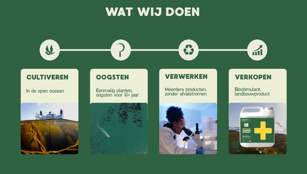 De geoogste kelp, alleen de toplaag wordt gebruikt, is op veel verschillende manieren te gebruiken, onder meer als bio-stimulant voor planten. Het is een duurzaam, niet chemisch alternatief om gezonde planten te krijgen.