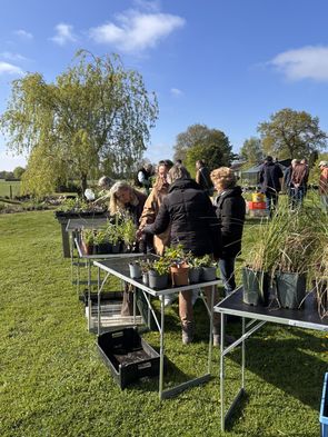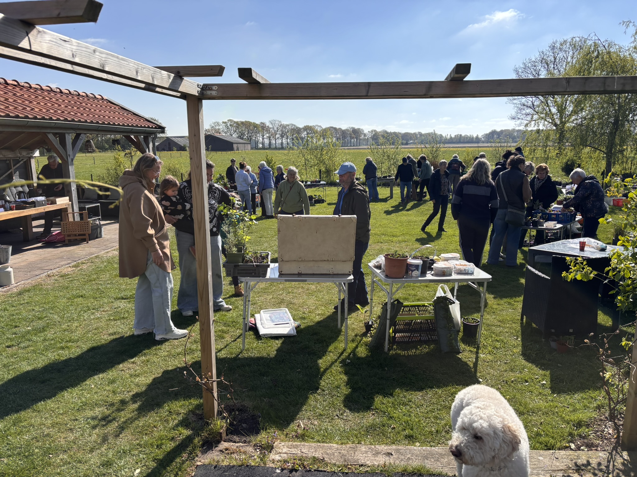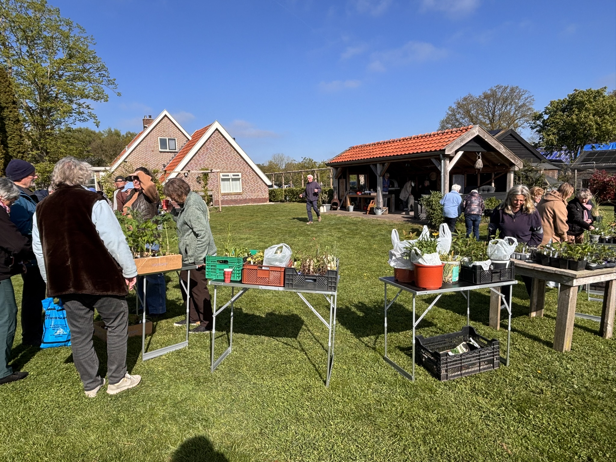 Wat hadden we een mooie locatie en wat was het prachtig weer. In een grote kring stonden heel veel tafeltjes klaar waarop de plantjes neergezet konden worden. We vroegen ons wel af of we ook te vinden waren op deze nieuwe plek. Nou, dat was geen probleem gelukkig, al hadden sommige navigatieapps er wat moeite mee.