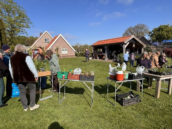 De sfeer was ontspannen en prettig; geen wonder als je begint met koffie, thee en wat lekkers en dan op je gemak rond kunt kijken. Daarna kon ieder de plantjes uitzoeken die je graag wilde hebben.