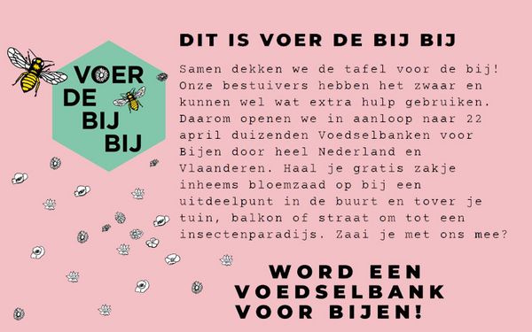 Zoals waarschijnlijk bij een ieder wel bekend hebben de bijen het zwaar. Om de enorme teruggang van bijen en vlinders te stoppen, hebben we onder meer miljoenen inheemse bloemen nodig. Op initiatief van The Pollinators gaan we die samen op 22 april inzaaien. Wil jij helpen door jouw bijdrage te leveren? Dat kan op twee verschillende manieren;